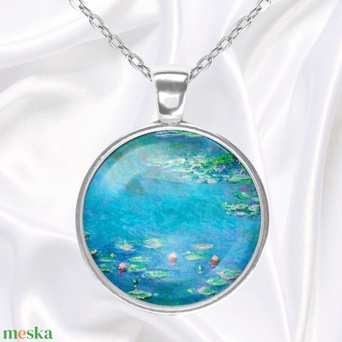 Kék üveglencsés medál vízililiomos Monet-festménnyel
