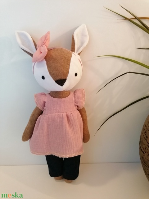 Őzike lány, rózsaszín ruhában, farmerben - kézműves gyerekjáték, öltöztethető játékfigura