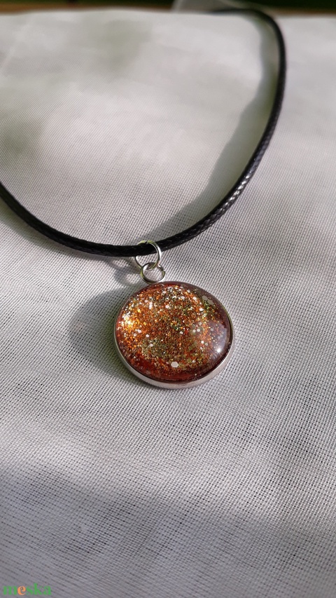 Ezüst- arany-borostyánszínű csillámpor díszítésű üveglencse medál, fekete viaszolt nyaklánccal
