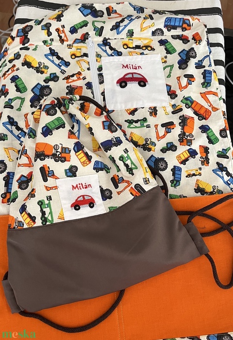 Ovis zsák / bölcsis zsák (Fiú fehér-narancs munkagépes)