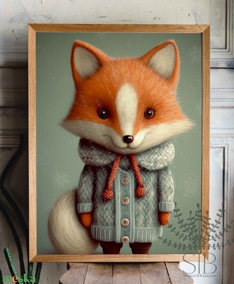 Róka pulcsiban, erdei állatos illusztráció gyermekszobai poszter kép