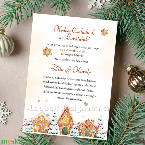 Nyomtatott esküvői meghívó, igazi mesebeli karácsonyi grafikával.