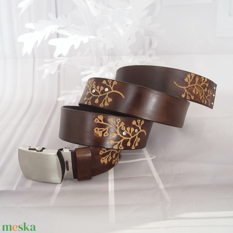 Női életfa stílusú marhabőr öv, Női sötétbarna virágmintás marhabőr öv