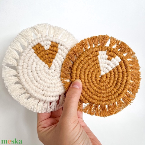 Őszi, sárga-natúr színű szívecskés makramé poháralátét szett (2 db)