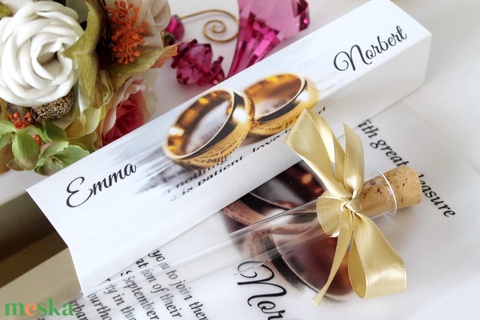 Igazi különlegesség boltunkban a dobozos esküvői meghívó kémcsővel típus. A kémcsőben egy pauszpapír található, a dobozos meghívó mintájával és a szöveges tartalommal. Fényképpel is kérhető a tekercs.