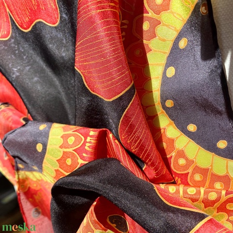 Fekete piros virágos mintás kézzel festett selyemkendő sál