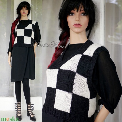 W-VEST - kézzel kötött merinó-kasmír mellény, pulóver / fekete, fehér KÉSZLETEN