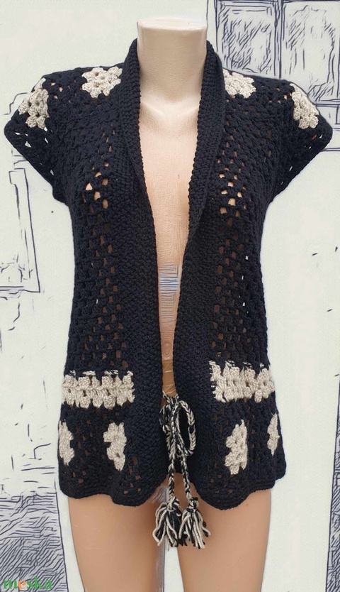 Kézzel horgolt mellény fekete teeskàvé szinnel nagyi kockával nagyi mintával horgolva M méret