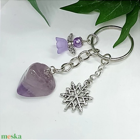 Ametiszt ásvány medálos kulcstartó lila angyalkával és ezüst színű hópehely fityegővel díszítve