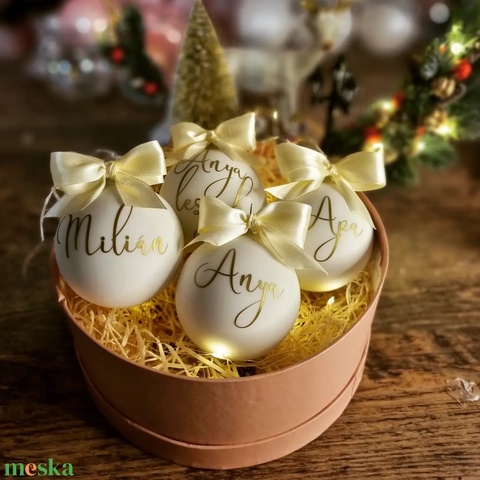 Fehér üveggömb szett 4db 8cm egyedi felirattal, családi csomag, gömbbox