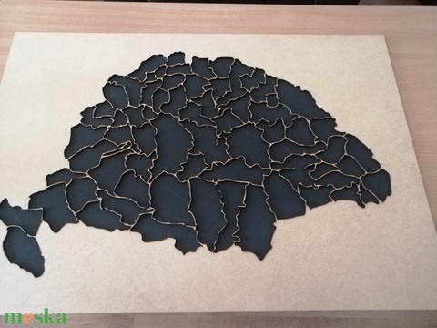 Mdf lemezből készült 75x50 cm méretű 2 rétegű falikép. Az alsó réteg kézzel feketére festve, a felső natúr színű. A megyék határai kiemelkednek az alsó fekete réteghez képest.