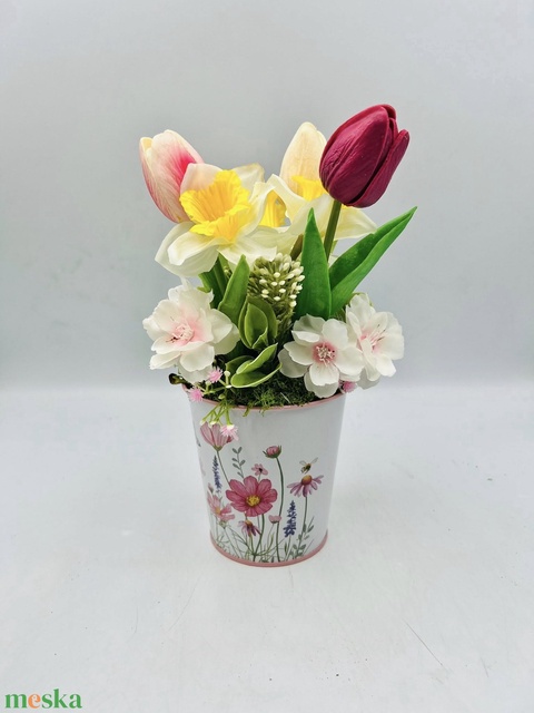 Tavaszi virágmix asztaldísz tulipánnal, nárcisszal és barackfa virággal