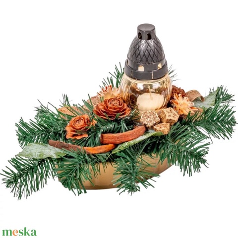 Sírdísz közepes hajóban üvegmécsessel, szárazvirággal M22x40cm