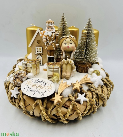 Arany–fehér diótörős adventi koszorú – 4 gyertyával, prémium dekorokkal (kb. 25–27 cm)