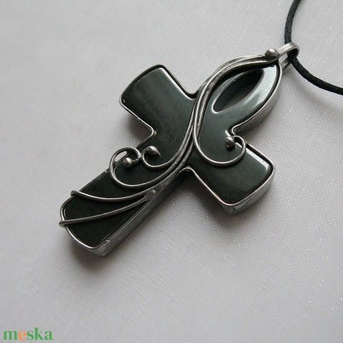 A medál Tiffany technikával készült hematit és ólommentes, ezüsttartalmú ón felhasználásával. A díszítés szintén saját készítésű, nem tartalmaz gyári elemeket. A fémrészt lekezeltem antioxidánssal és lelakkoztam, hogy sokáig szép maradjon.
