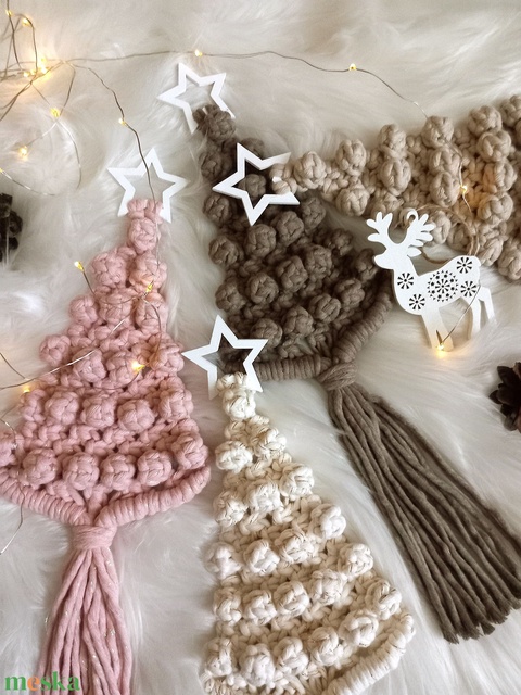 Rózsaszín, ezüstszálas makramé karácsonyfa, fenyőfa, bogyókkal díszítve