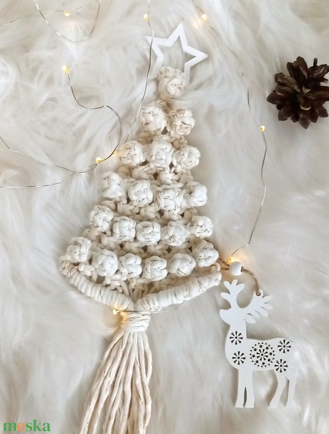 Aranyszálas makramé karácsonyfa, fenyőfa natúr színben bogyókkal
