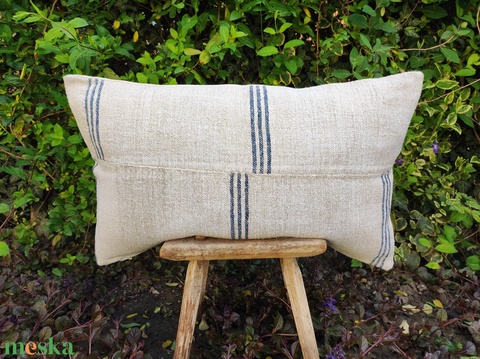 Egyedi, hangulatos, farmhouse–vidéki stílusú párnahuzat, mely autentikus, természetközeli karaktert visz otthonodba. Elöl erős szövésű, indigókék csíkos zsákvászon kapott helyet, amely strapabíró és rusztikus megjelenésű. A hátoldal antik lenvászonból készült, így a huzat különösen egyedi, időtálló és természetes textúrákkal gazdagított darab. Csak egy darab készült belőle.