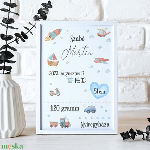 Fiús baba születési adatok dekor print A/4-es méretben (digitálisan vagy fotópapírra nyomtatva, keretezve) fekete-fehér