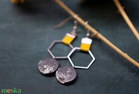 Szürke fülbevaló sárga bőr és fém kiegészítővel