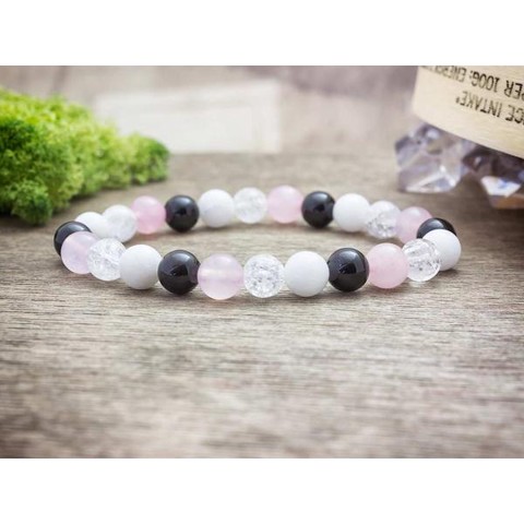 Jáde, ónix, rózsakvarc és roppantott hegyikristály ásványokból fűzött gumis karkötő. Amit a jádéról érdemes tudnod:A Jáde egy gyűjtőcsoportja a kövek egy fajtájának.Lelki gyógyhatása:Több örömmel és életkedvvel ajándékoz meg minket. Növeli a bennünk lévő szeretetet, a harmónia iránti igényünket.Testi gyógyhatás:Szabályozza a szervezet sav-bázis egyensúlyát, illetve vízháztartását is, mivel pozitív hatással bír a vese, húgyhólyag működésére is. Méregtelenítő hatású, segít a méreganyagok kiválasztásában, elvezetésében.Hozzárendelt mágikus hatás:Növeli használójának tudatosságát és hosszú, egészséges élettel ajándékozza meg. A kínaiak a jádét a legfőbb erények megtestesítőjének tartják: bölcsesség, bátorság, irgalmasság és szerénység szimbóluma.Csillagjegyei: Mérleg, Halak, RákCsakrái: Szakráliscsakra, Napfonatcsakra, SzívcsakraAmit az ónixról érdemes tudnod:Az ónix általában fekete, néha előfordulhat fehér, szürkés csíkozódással is.Lelki gyógyhatása:Az ónix egy védelmező kő, amely a negatív energiák ellen véd. Csökkenti a befolyásolhatóságunkat, növelve így az önbizalmunkat, egészséges egónkat. Egyensúlyba hozza a külsőnket és belsőnkkel, így magabiztosabban mozoghatunk a világban, stabilitást, ellenálló képességet, kiegyensúlyozottságot biztosítva ezáltal. Bánat és melankólia esetén is hatásos.Testi gyógyhatás:Erős hatással van az agy tevékenységére, javítja a koncentrációt, de használhatjuk Alzheimer-kór és epilepszia ellen is. Hat a fülre és azok betegségeire, mint pl. fülgyulladás, - fájás, -zúgás, hallásromlás. Szintén hatásos látásgyengeség ellen is. Erősíti az immunrendszert.Hozzárendelt mágikus hatás:A legtöbb népnél a fekete ónix védelmező kőként szolgált a rontások, fekete mágia ellen. Sokan ma is negatív energiák elleni védelemre használják.Csillagjegyei: Nyilas, Bak, VízöntőCsakrája: GyökércsakraAmit a hegyikristályról érdemes tudnod:A kristály szavunkat igen sokféle vonatkozásban használjuk, pl. kristálygyerek, kristálytiszta, kristálygömb, de egy biztosan közös ezekben a szavakban, hogy bármiféle szövegkörnyezetben is fordul elő, biztosan üdítő természetesség és tisztaság jut eszünkbe róla. De nem csak magyar nyelvünk használja gyakran a nevét, nem is gondolnánk, hogy mennyi minket körülvevő tárgy tartalmaz kristályt. Az óra a karunkon, vagy a számítógépünk, oszcillátorok, rádiók, televíziók, telefonok, ipari és gyógyászati felszerelések..., ezek mind-mind működésképtelenek lennének kristály nélkül, hiszen a kristály egy elemi dolog! A kristály, (amelyről az ókori görögök úgy tartották, hogy örökké fagyott jég az isteneiktől és ezért nevezték "Kristallos"-nak, amelynek jelentése "jég") metafizikai síkon is nélkülözhetetlen. Mindenkinek szüksége lenne egyre! Minden zodiákus jegyhez hozzárendelhető és mindegyik csakrához használható. Ez maga a tiszta és erőteljes energiaforrás, amely felfogja, aktiválja, megőrzi, átalakítja, erősíti az energiát. Kirlián fotózások alkalmával a kézben tartott hegyikristállyal az energiamező legalább kétszer olyan erősnek látszik. Egyszerűen lenyűgöző!Lelki gyógyhatása:A hegyikristály minden gyógy kövek koronázatlan királya, amely fokozza az összes többi kő hatását. Kiegyensúlyozó, nyugtató hatással bír a lélekre. Hat a szellemi kimerültség ellen. Aura tisztító, erősítő és védelmező. Növeli a kifejezőerőnket, kiegyenlíti a lelki diszharmóniát, aktiválja a felettes tudatunkat. Segít a felettes énnel való összeköttetés megteremtésében, ezért kitűnően használható meditáció alatt. Szellemi fejlődésünket is segíti, illetve szellemi határaink kitágulását. Javítja az intuíciónkat, telepatikus képességeinket. Használhatjuk a tér atmoszférájának tisztítására, a káros környezeti sugárzás csökkentésére, illetve a lelki sebek gyógyítására.Testi gyógyhatás:A testi gyógyításban olyan széles spektrumon használható, hogy annak a felsorakoztatására oldalunk nem alkalmas, így csak egy kis ízelítőt nyújthatunk. A hegyikristály minden területre hat gyógyító, gyulladás- és fájdalomcsökkentő hatással. Használhatjuk szemre, bőrre, ízületre, hátra, belekre, emésztőrendszerre. Mivel a test negatív rezgéseit pozitívvá alakítja, ezért daganatos megbetegedések esetén is javasolt használata. Ha egy területre megtaláljuk gyógy kövünket, vagy a saját személyes ásványunkat, annak a hatása megsokszorozható a hegyikristály segítségével.Hozzárendelt mágikus hatás: A hegyikristály egyesek szerint testi, lelki megfiatalító hatással bír.Csillagjegyei: összes csillagjegyCsakrái: az összes csakraAmit a rózsakvarcról érdemes tudnod:A festetlen rózsakvarc az egész világos, szinte áttetszőtől, a ködös középrózsaszínig terjed. Az egyik legnépszerűbb kövek egyike, amely szépséges küllemének és erős gyógyhatásának köszönhető. Története a görög és római mitológiába nyúlik vissza, amely szerint a rózsakvarc Erósznak és Ámornak a szerelem Isteneinek az emberek felé nyújtott ajándéka.Lelki gyógyhatás:Már tehát az ókoriak is hittek a kő szerelem terén gyakorolt pozitív hatásaiban. A rózsakvarc a szívcsakrán keresztül segít az érzelmi blokádok feloldásában, megnyitja belső kapukat, hogy a csodát, szeretetet és szerelem formájában magunkévá tehessük. Érzelmi blokkok feloldása a szerelem lelki és testi kiteljesedését segíti. Az érzelmi gátak felszabadítása a termékenységet is magában hordozza, így ez a kő terméketlenség esetén is hasznos lehet. A rózsakvarc egyéb területeken is bizonyíthatja pozitív hatásait. Mivel segít megtal