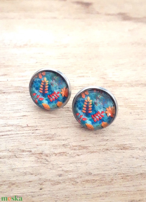Őszi levelek csipkebogyóval nemesacél fülbevaló, kék kékeszöld