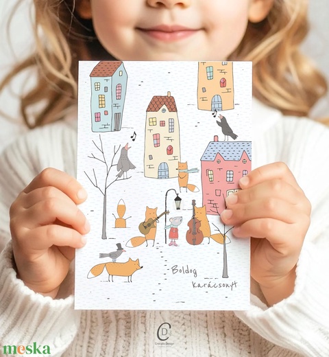 Karácsonyi képeslap, rókás üdvözlőlap, városi zenészek, ajándékkísérő