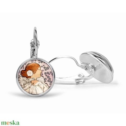 Kaméliás hölgy, üveglencsés fülbevaló Alphonse Mucha festményével (nemesacél alappal is)