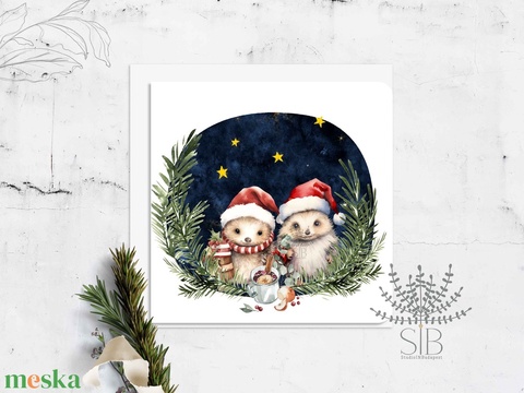 Karácsonyi képeslap vidám süni párral