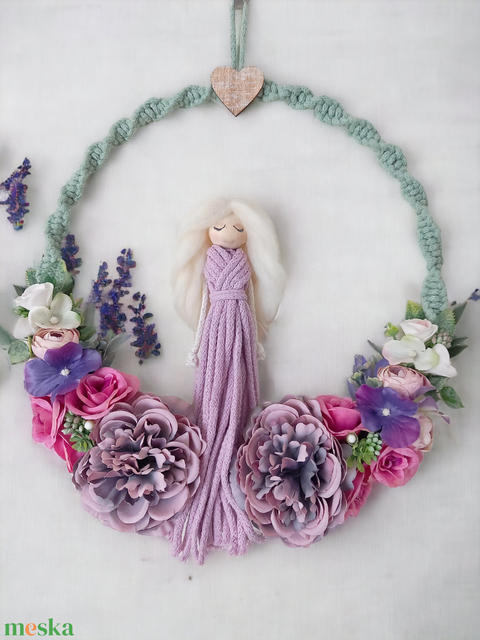 - Anyaga: makramé fonal, fém karika, fa golyó, selyemvirág