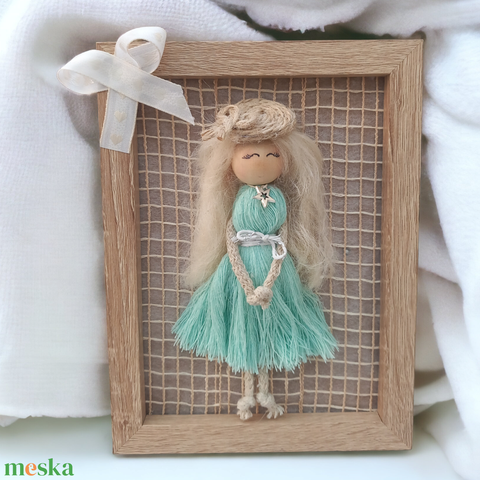 Makramé lány képkeretben – türkiz ruhás, kalapos figura