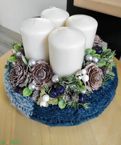 - Anyaga: szalmakoszorú, tüzőhab, gyertya, termések, bogyók, műzöldek, ezüstgömb, kötött textil