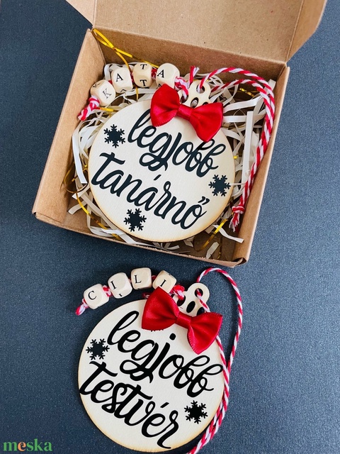 Egyedi szöveges karácsonyfadísz névvel ajándékdobozban