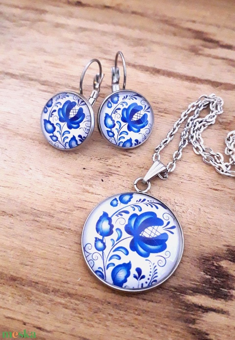 Kék Matyó mintás nemesacél nyaklánc franciakapcsos fülbevaló szett Magyar motívum Üveglencsés népies