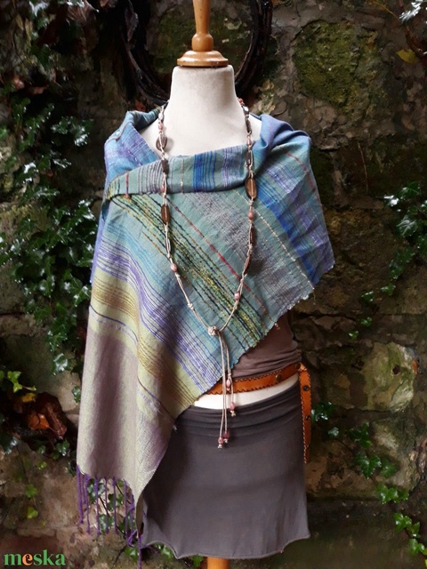 Hosszú, rojtozott kendő vizes- kékes, türkizes, olívazöld átmenettel. A dekorvetülékben olajzöld és okker, rőtszín futkos, lilák dorbézolnak, encián hasít.