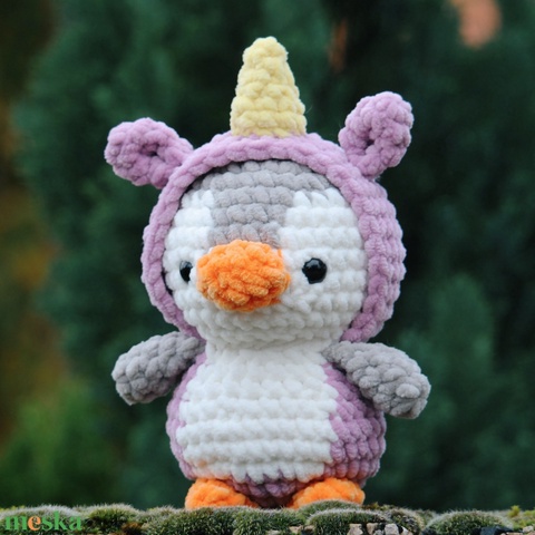 Horgolt pingvin plüss, egyszarvú jelmezben