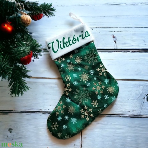 Névre szóló mikulás csizma, zöld-fehér-arany színben
