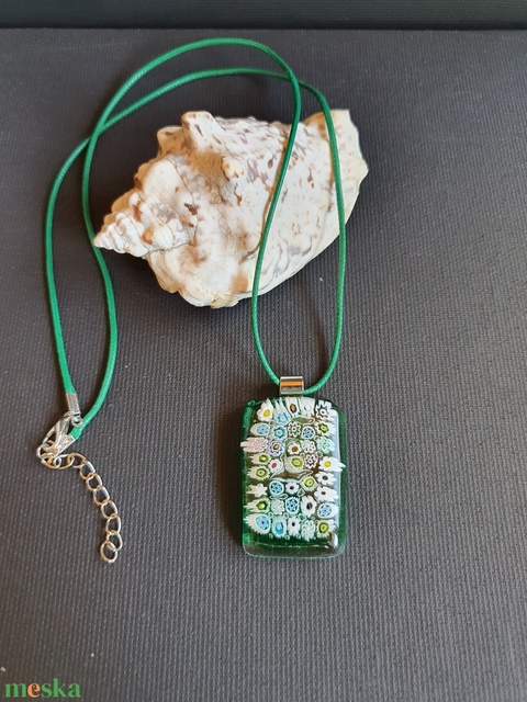 Zöld alapú- millefiori szeletekkel díszített üveg medál, zsinór nyaklánccal