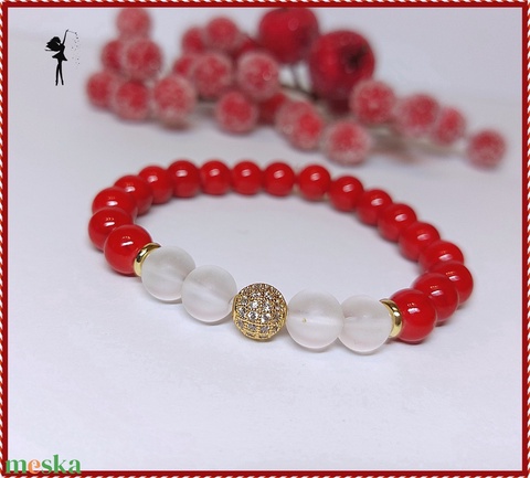 Csendes éj aranyban I. ásványkarkötő piros jádéból, matt hegyikristályból, arany cirkónia gyönggyel