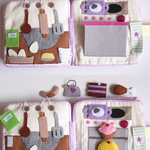 A másik oldalon egy gáztűzhely van, amelynek gázlapja tépőzáras, így rátépőzárazható a lábas, a teafőző. A sütő lenyitható, a benne lévő két szintre szintén rátépőzárazhatók az ételek (sült csirke comb, pite, muffin, kifli, torta). A konyharuha patenttal rögzített.
