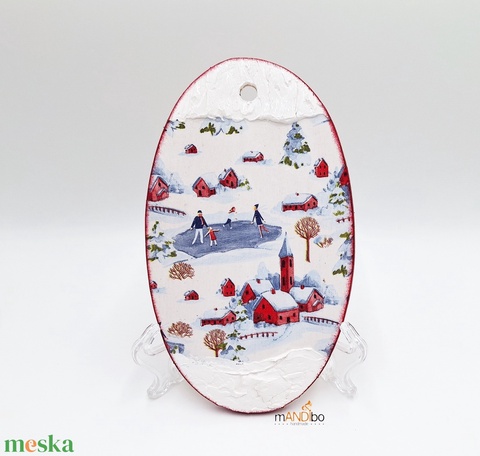 Karácsonyi óvális deszkakép dekoráció - Havas téli táj vágódeszka