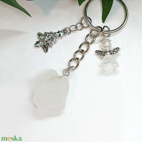Nyers hegyikristály ásvány medálos kulcstartó fehér angyalkával és ezüst színű fenyőfa fityegővel díszítve
