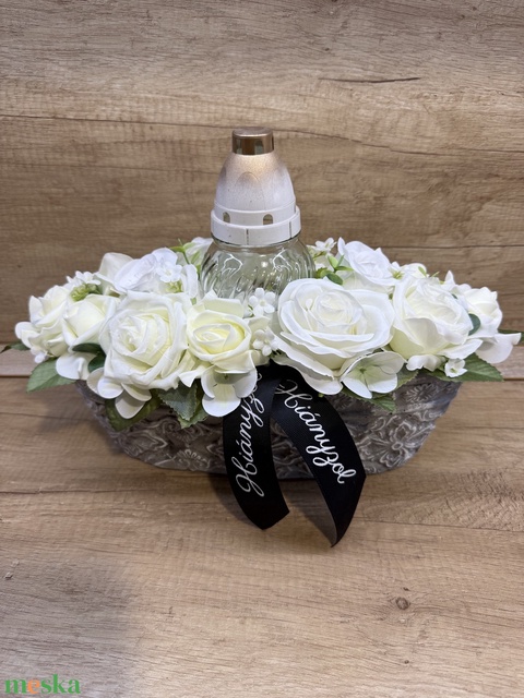 Fehér sírdísz mécsessel