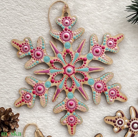Karácsonyfadísz - pink és türkiz jégvirág / Hópehely mandala (15 cm, kétoldalas)