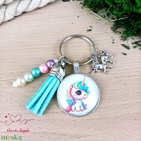 Unikornis kék bojtos üveglencsés kulcstartó táskadísz