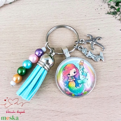 Sellő kék bojtos üveglencsés kulcstartó táskadísz