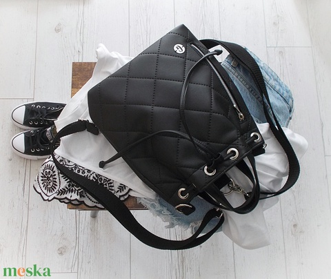 - Anyaga: mágneskapocs, fém ringli, cippzár, műbőr, pamut vászon, karabiner, fémkellék, műbőr