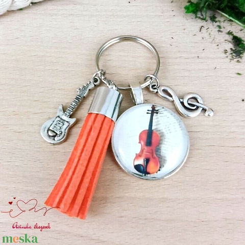 Hegedű sárga bojtos üveglencsés kulcstartó táskadísz