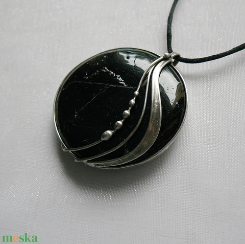 A medál Tiffany technikával készült fekete turmalin ( sörl ) és ólommentes, ezüsttartalmú ón felhasználásával. A díszítés szintén saját készítésű, nem tartalmaz gyári elemeket. A fémrészt óezüstre patináztam, lekezeltem antioxidánssal és lelakkoztam, hogy sokáig szép maradjon.