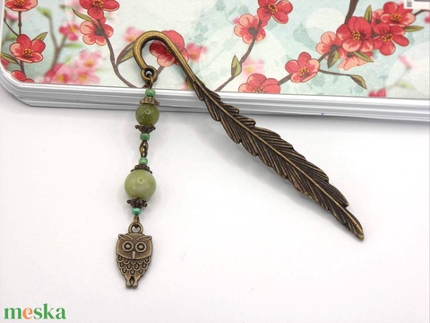 AJÁNDÉK csomagolás! Antik bronz, toll alakú könyvjelző kínai jáde ásványgyöngyökkel, bagoly alakú függővel – Kuvik